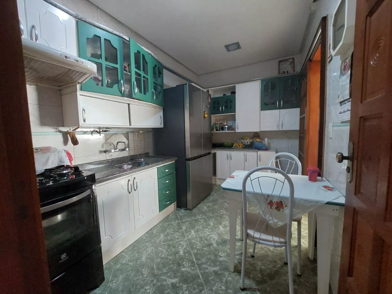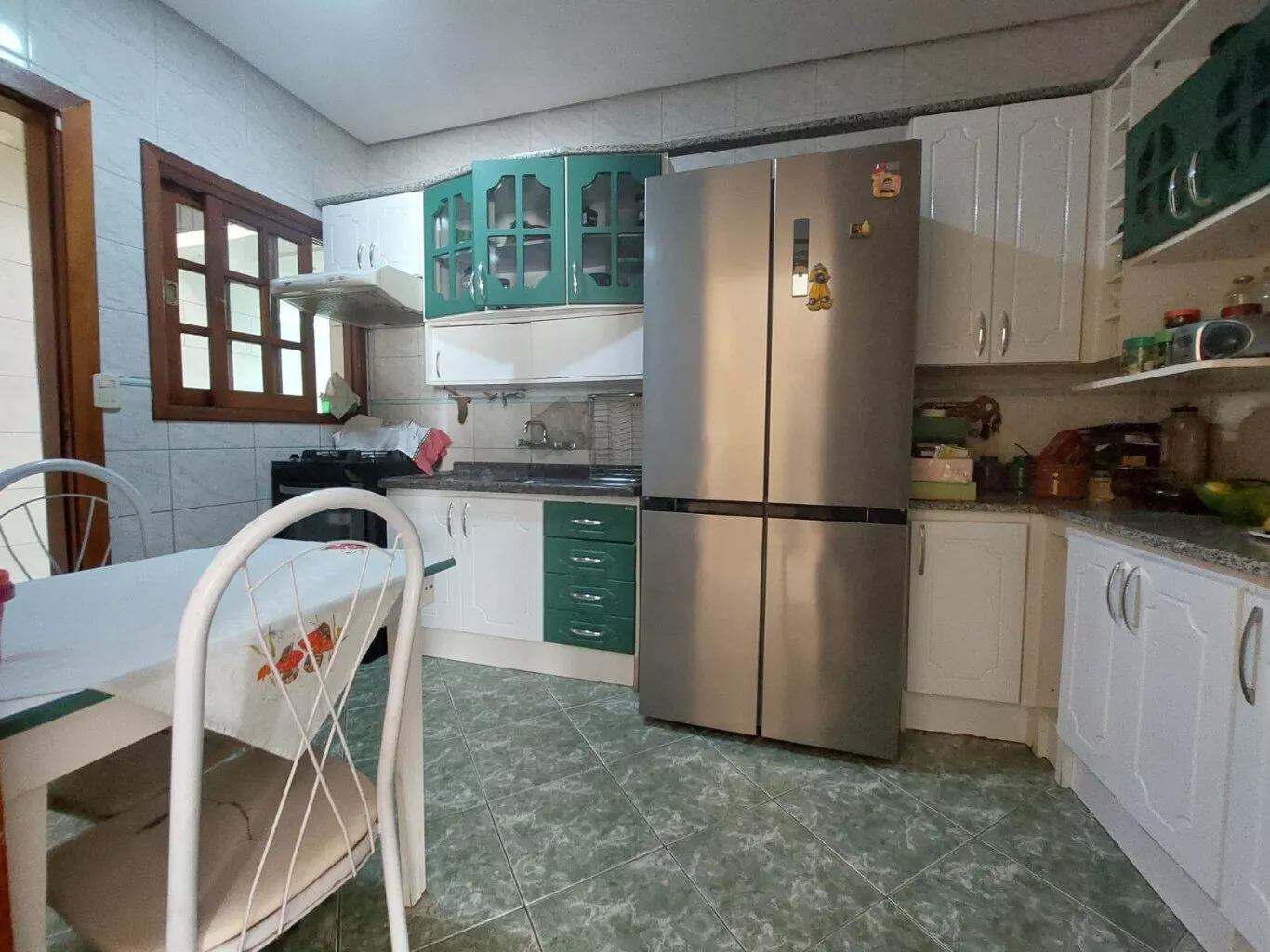 Cozinha confortável onde possui espaço para mesa de janta.